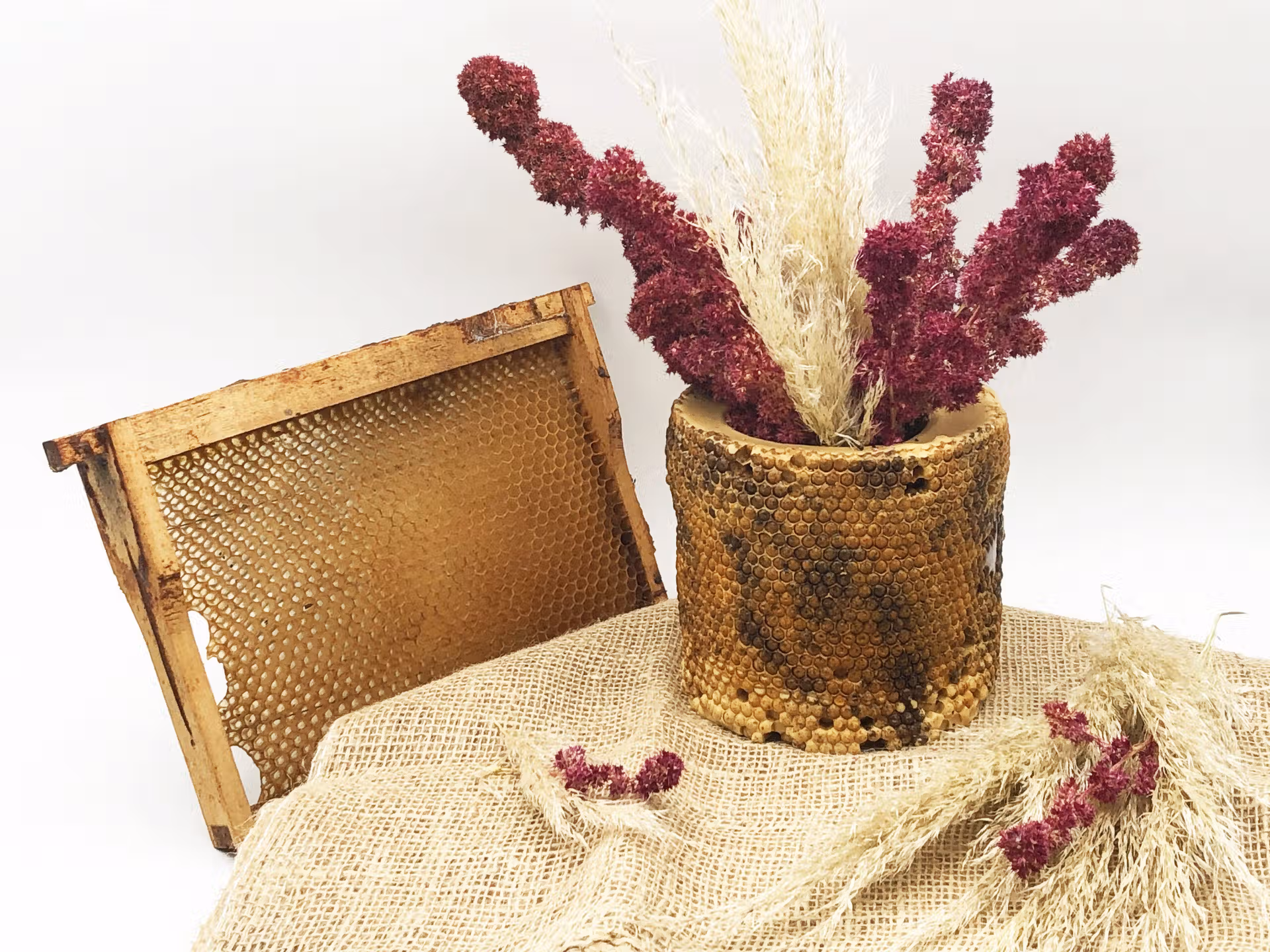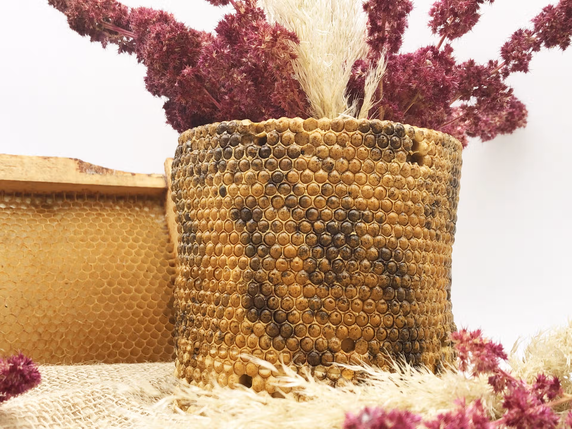 Le vase « pot alvéoles » reprend les motifs alvéoles d’un cadre de cire construit par les abeilles.